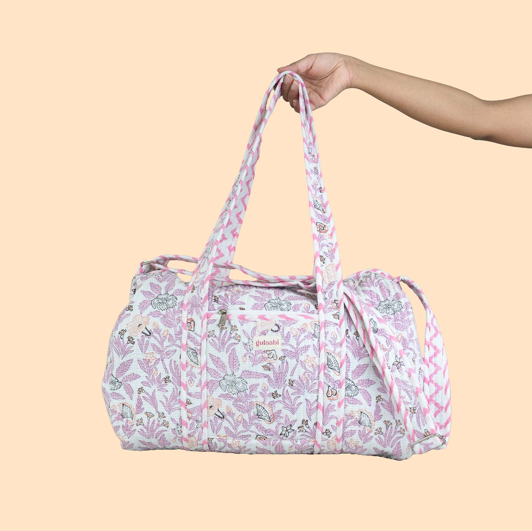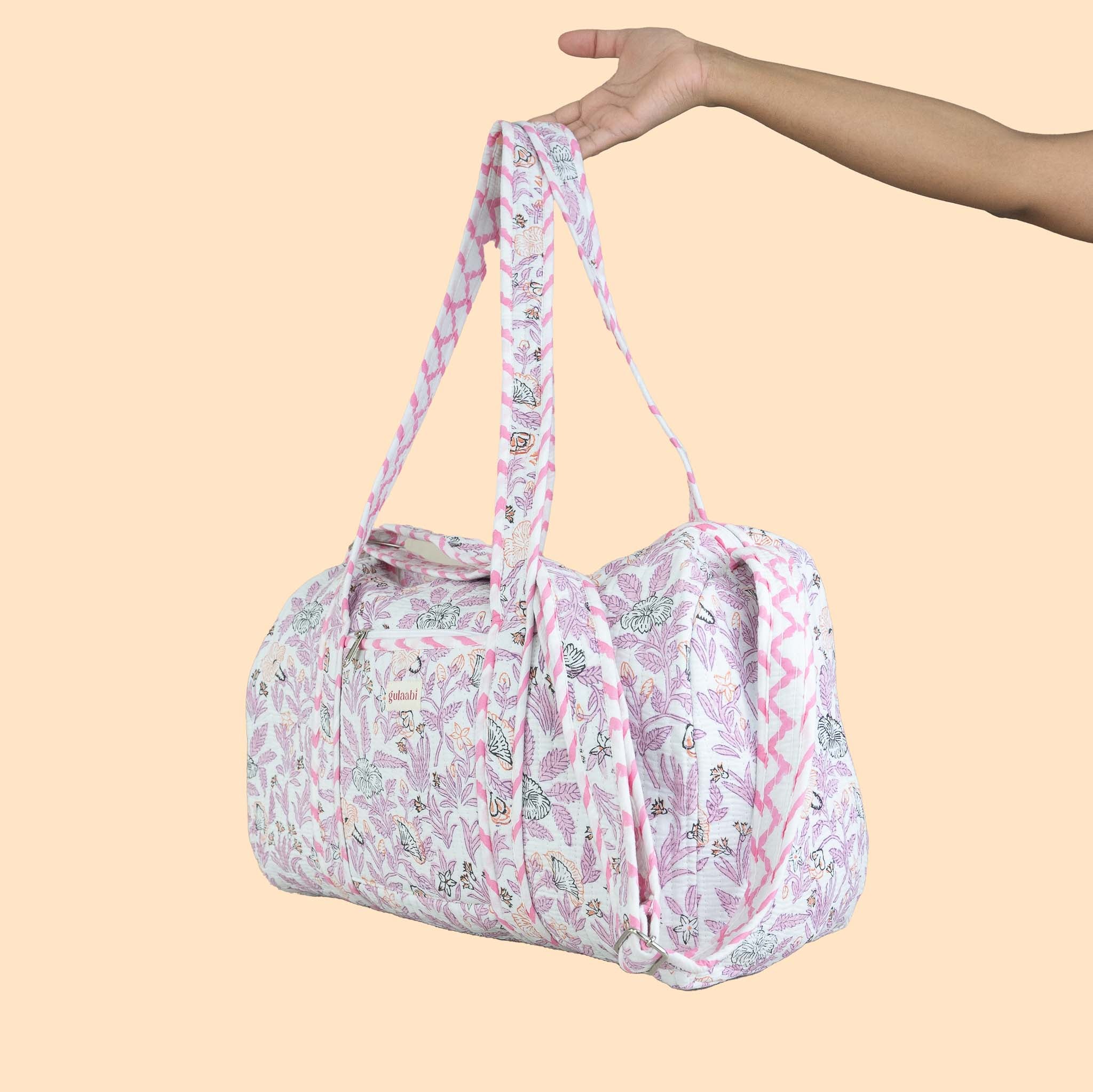Experience the luxurious comfort of our quilted cotton Saanchi Duffel Bag, handcrafted with beautiful block printed designs. With its spacious interior, this bag is the perfect companion for all your travels.