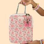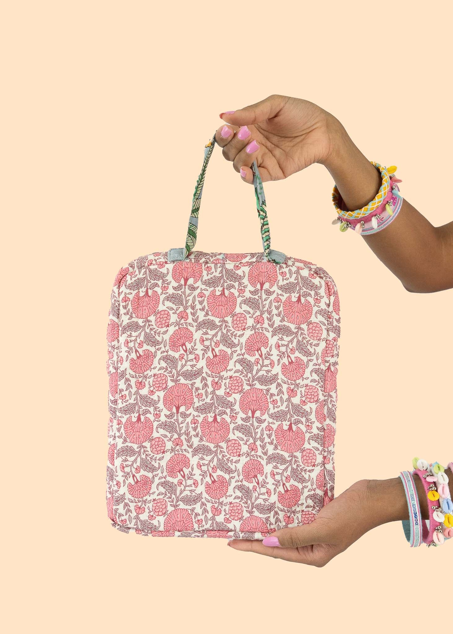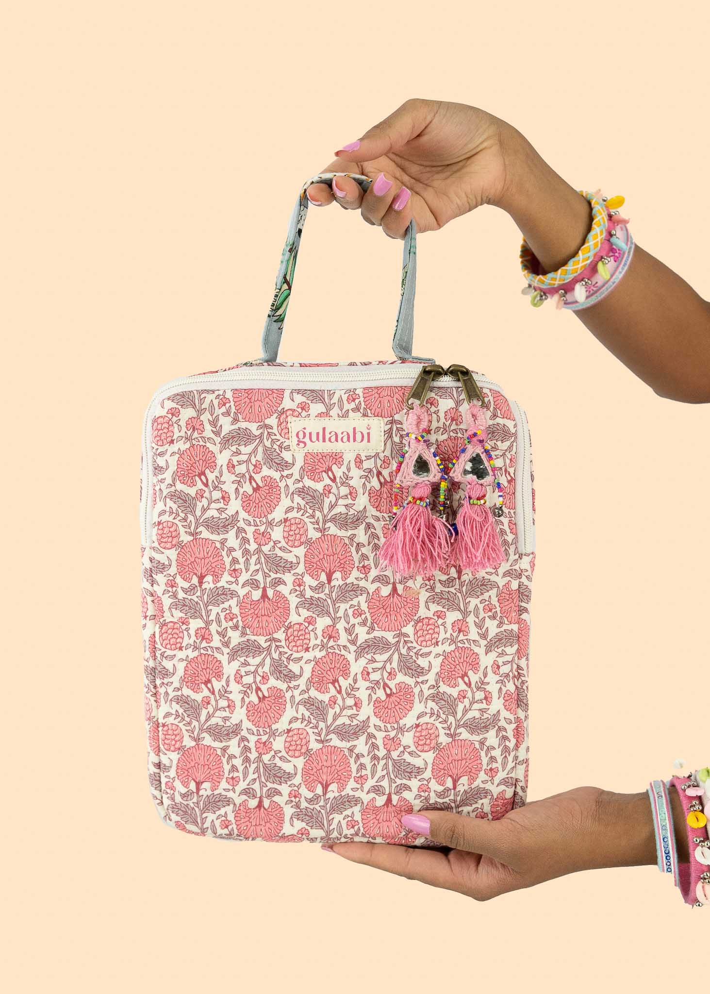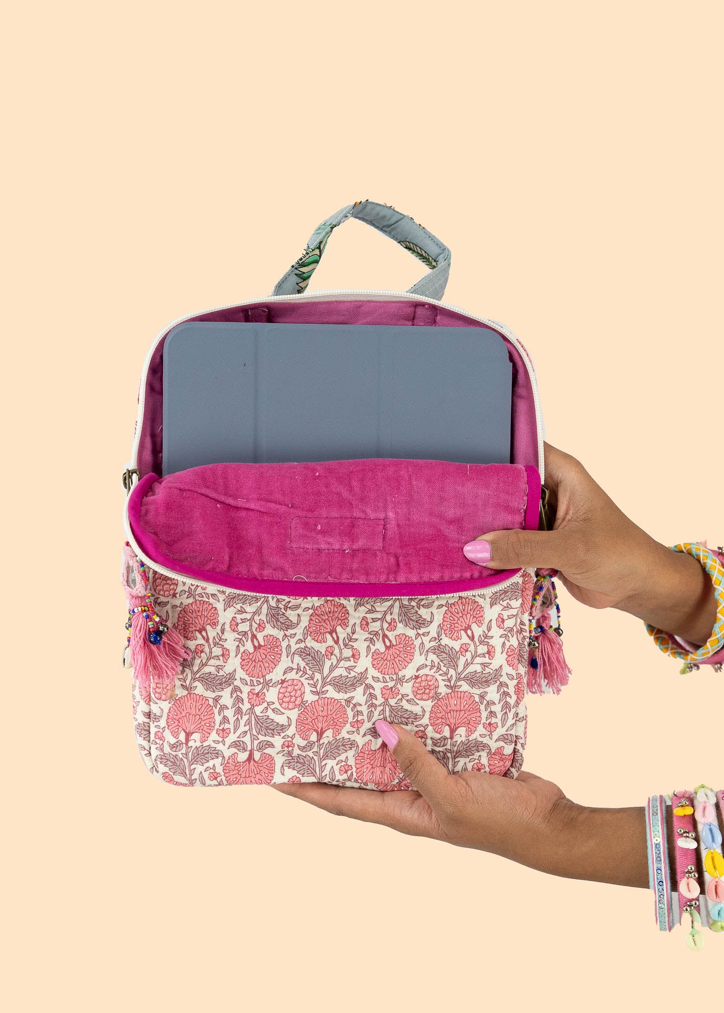 Protect your iPad in style with the Bagiya iPad sleeve. Made from quilted cotton and featuring a unique block print, this sleeve offers both fashion and function. The convenient zipper and handle make it easy to carry, providing your iPad with the ultimate protection.