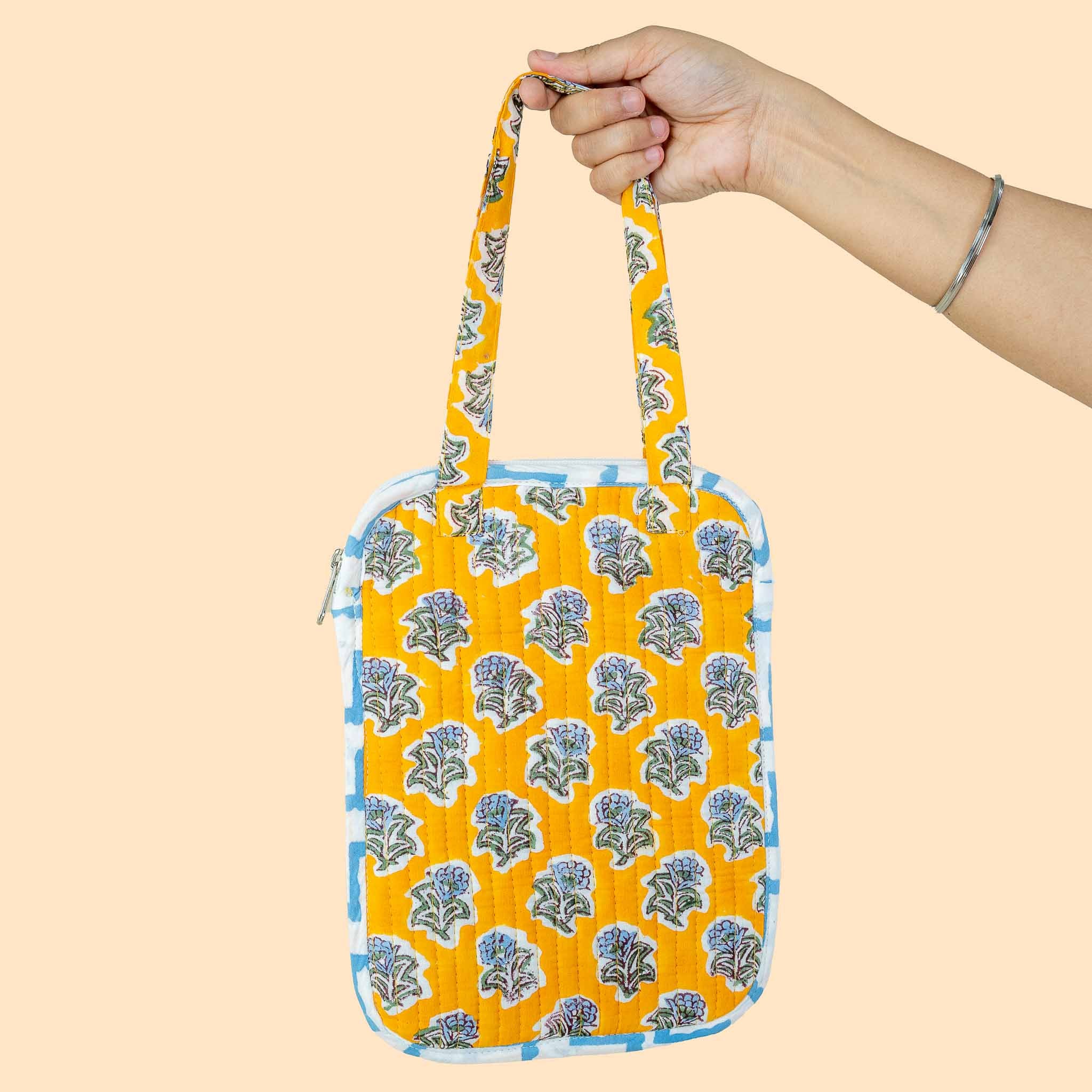 Protect your iPad in style with the Jivika iPad sleeve. Made from quilted cotton and featuring a unique block print, this sleeve offers both fashion and function. The convenient zipper and handle make it easy to carry, providing your iPad with the ultimate protection.