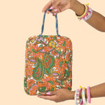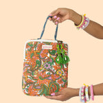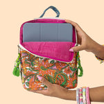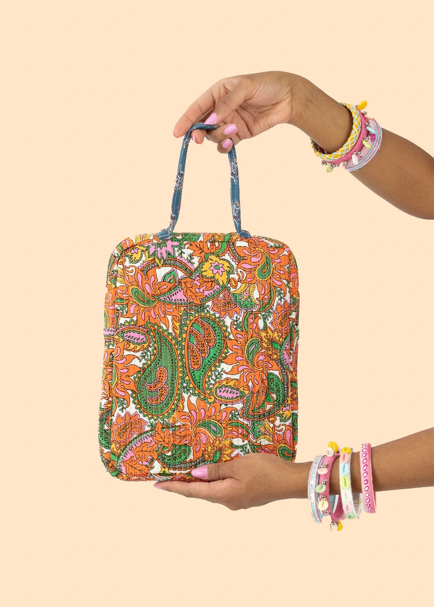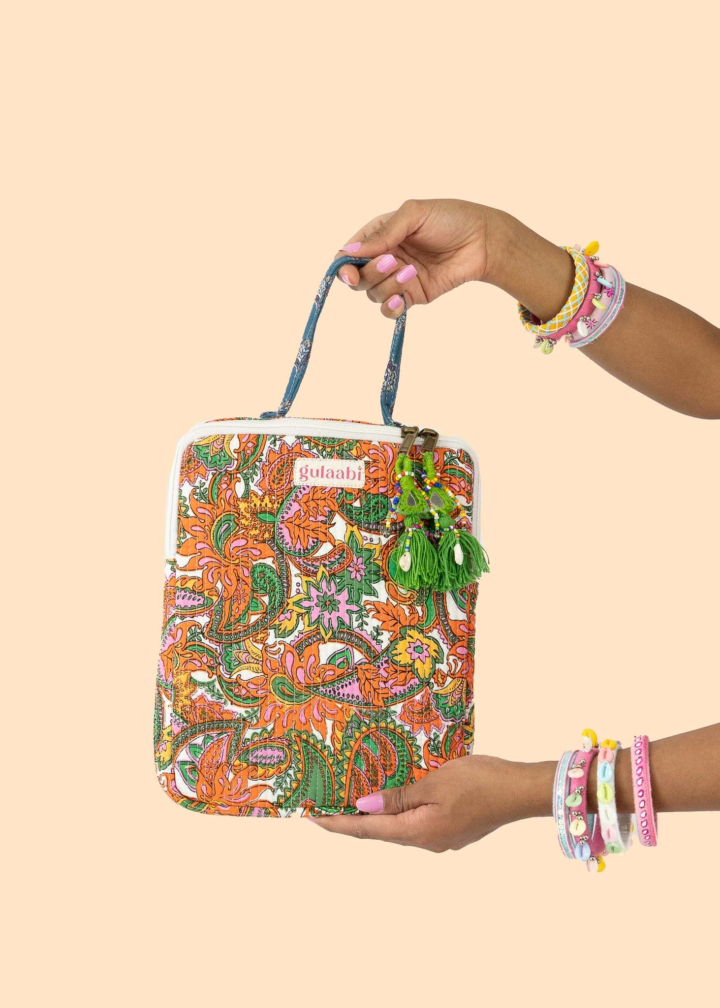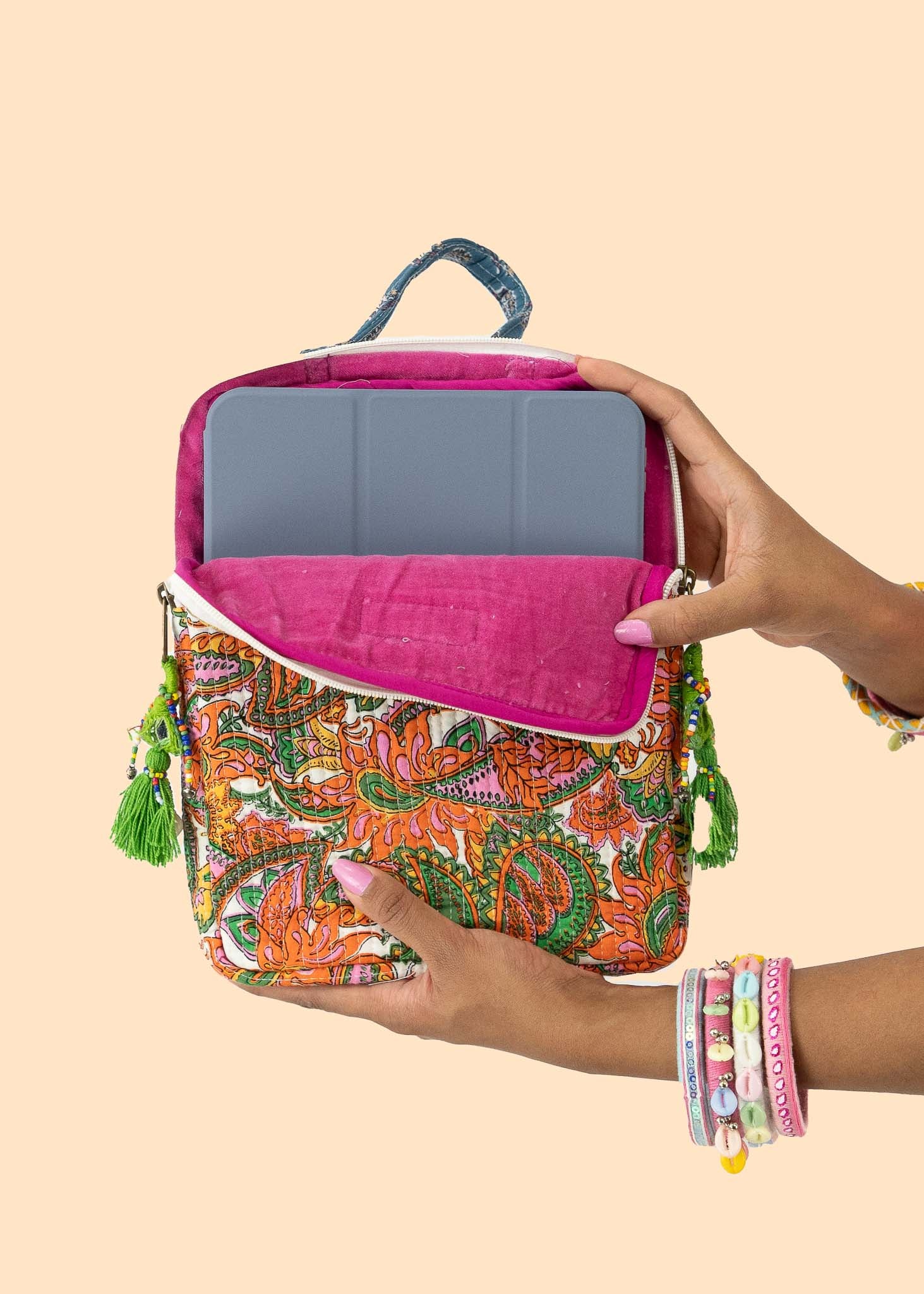 Protect your iPad in style with the Rangeen iPad sleeve. Made from quilted cotton and featuring a unique block print, this sleeve offers both fashion and function. The convenient zipper and handle make it easy to carry, providing your iPad with the ultimate protection.