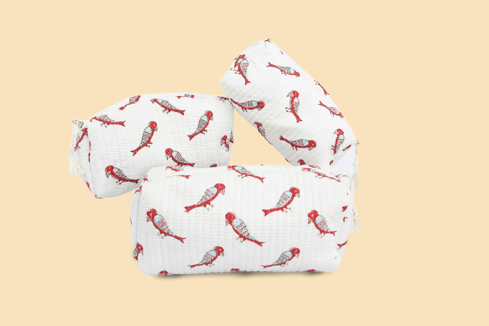 Introducing our versatile Parrot Parade 3-piece makeup/toiletry pouch set, a must-have for organizing your essentials, makeup, and more. Each set includes small, medium, and large pouches, meticulously crafted in India with exquisite block print designs and quilted detailing. Stay stylishly organized on the go with this elegant set, blending traditional charm with modern functionality.